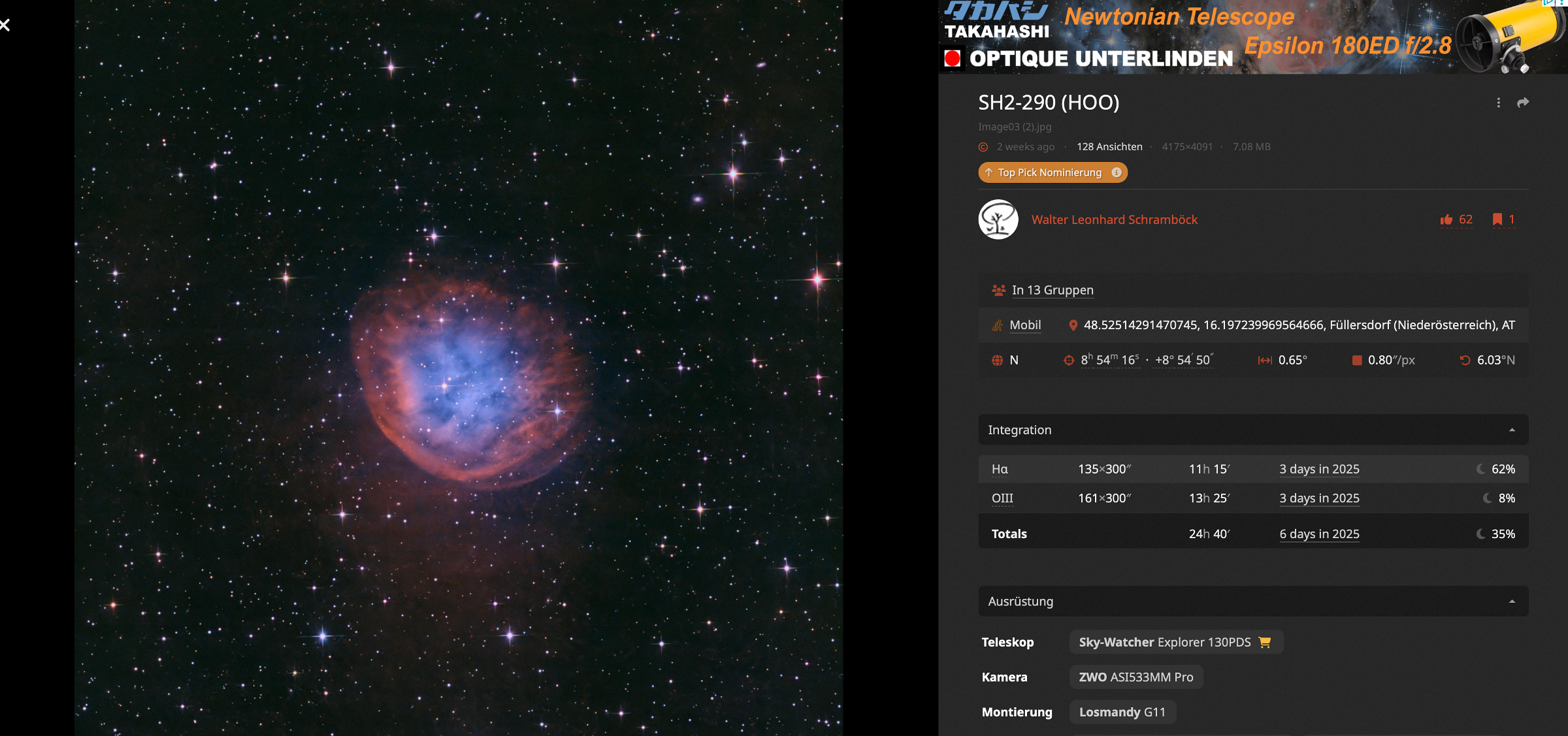 Der neue Lacerta Newton Reflektor hat mir zu meinem ersten "Stern" auf Astrobin verholfen, das heißt, dieses Bild wurde zum Top-Pick gewählt, eine der begehrten…