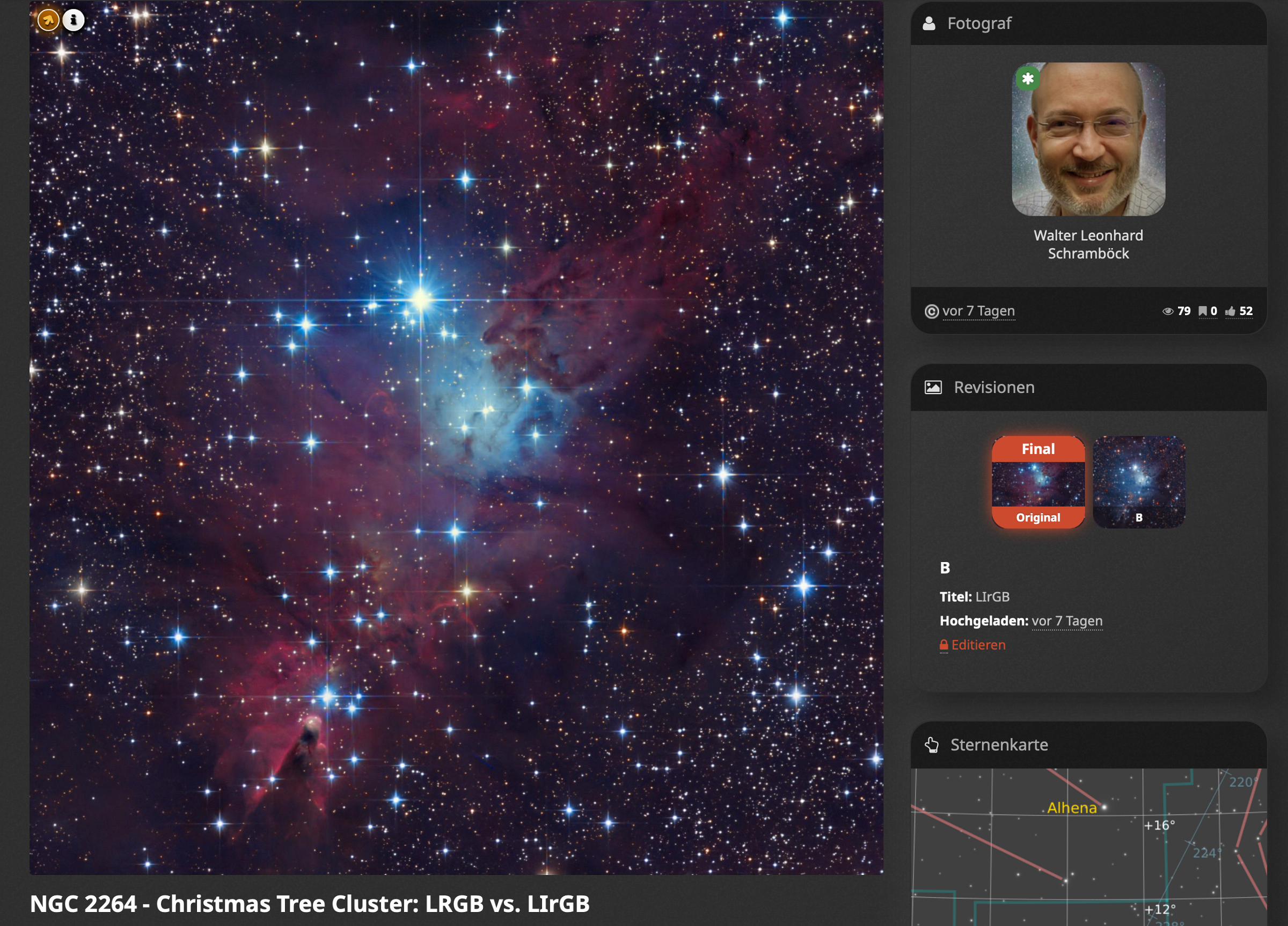 Meine Vergleichsaufnahmen zum Christbaum-Cluster sind nominiert worden für ein Top-Pick auf Astrobin.