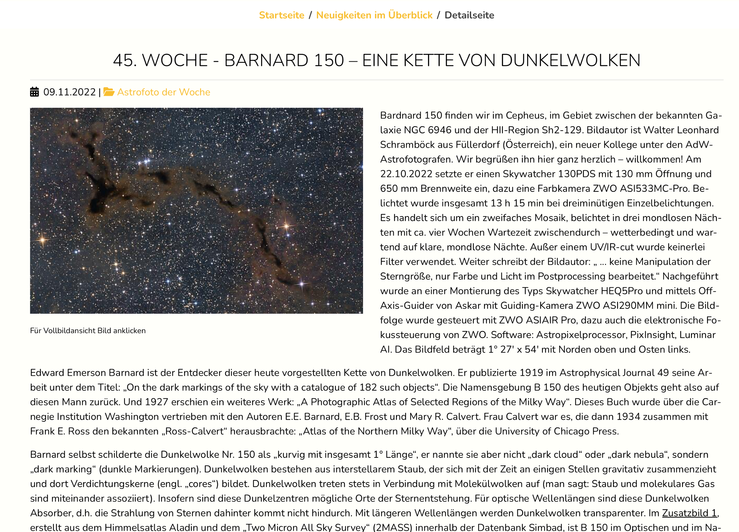 Astrofoto der Woche auf www.astronomie.de: https://www.astronomie.de/aktuelles-und-neuigkeiten/detailseite/45-woche-barnard-150-eine-kette-von-dunkelwolken