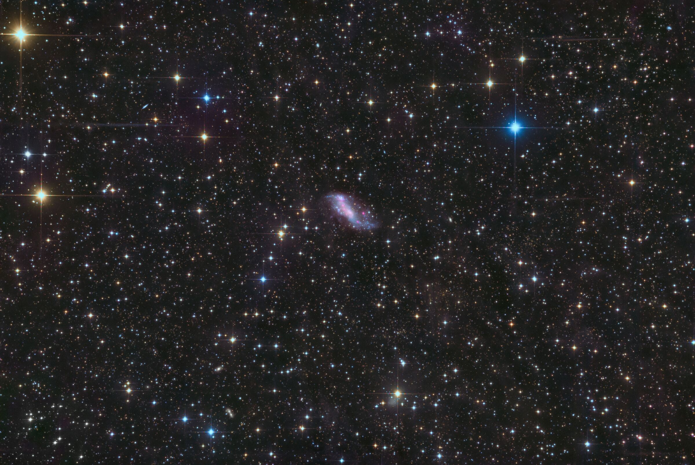 IC 2574 alias Coddington's Nebula ist eine irreguläre Balkenspiralgalaxie (je nach Quelle auch als Zwerg-Spiralgalaxie oder Zwerggalaxie tituliert), die 1898 von Edwin Coddington entdeckt und damals als Nebel eingestuft worden ist. Sie gehört zur M81 Galaxiengruppe im großen Bären (ursa maior), ist etwa 11 Mio Lichtjahre von uns entfernt und misst ca. 45000 Lichtjahre im Durchmesser. Ihre niedrige Flächenhelligkeit wäre aber eher typisch für Zwerggalaxien. Sie hat einen sehr hohen Anteil an dunkler Materie (90%), was sie zu einem interessanten Forschungsobjekt bezüglich Galaxien-Dynamik macht. Auch befinden sich ungewöhnlich massereiche Sternencluster in ihr, ähnlich wie bei Omega Centauri. IC 2574 hat jedoch keine Wechselwirkung mit den Hauptgalaxien der Gruppe, ihre Sternentstehung findet isoliert statt. Ich habe diese Galaxie mit der alten CCD-Kamera von SBIG durch den kleinen Skywatcher Newton aufgenommen. Dadurch ergibt sich ein sehr weites Feld, das der große Kodak Sensor ziemlich tief erfasst hat. All die winzigen gelblich-rötlichen Pünktchen im Hintergrund sind extrem weit entfernte Galaxien. In IC 2574 selbst findet massiv Sternentstehung statt, weshalb ich zusätzlich auch Aufnahmen mit dem H-alpha Filter gemacht habe, damit werden die purpurnen H-alpha Knötchen deutlicher sichtbar. Ausrüstung: Teleskop - Skywatcher 130/650 PDS (schwer modifiziert) Kamera - SBIG STL 11000M Filter - Touptek LRGB+Ha 2" Nachführung - Skywatcher HEQ5 Pro Steuerung - Mini-PC mit NINA Belichtung: zusammen 22 h 12 min 30 s